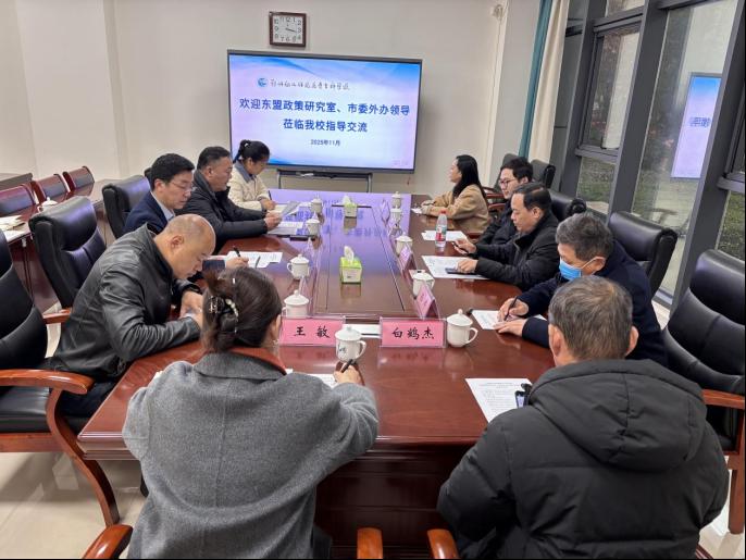 2025年11月6日下午,东盟政策研究室副主任陈民浩、郑州市人民对外友好协会副会长、秘书长童卫军一行莅临我校指导交流。副校长张元奎及相关部门负责人参加座谈。