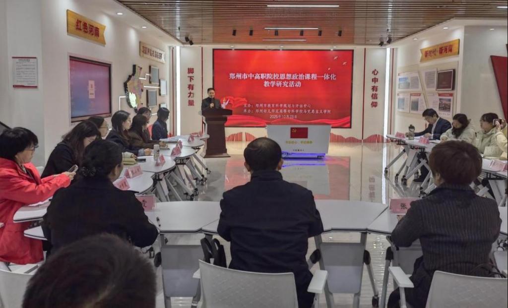 10月23日上午,由郑州市教育科学规划与评估中心主办、郑州幼儿师范高等专科学校承办的郑州市中高职院校思想政治课程一体化教学研究活动成功举办。郑州市中职思政学科中心组组长、华北水利水电大学、郑州航空工业管理学院等4所高校马克思主义学院院长及近30位兄弟院校的思政课教师代表参会,活动由郑州市教育科学规划与评估中心教研员郭广一主持。