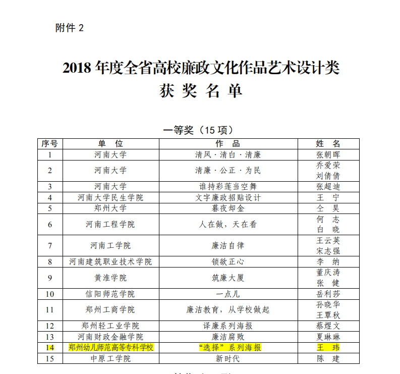 为深入学习贯彻习近平新时代中国特色社会主义思想和党的十九大精神,全面落实全国全省高校思想政治工作会议精神以及中央、省委关于党风廉政建设和反腐败工作的新部署新要求,2018年省委高校工委、省教育厅在全省高校开展了以“廉洁从政 廉洁用权 廉洁修身 廉洁齐家”为主题的廉政文化作品征集评选活动,我校美术系教师王玮的平面设计类作品《“选择”系列海报》斩获艺术设计类一等奖,舞蹈系教师沈琬茹、陈岩、刘爽的舞蹈《永不褪色的誓言》斩获表演艺术类一等奖,我校斩获优秀组织奖。