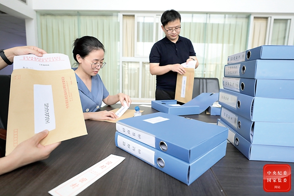重庆市巴南区纪委监委探索推行定向签发工作提醒函,由区纪委书记将监督检查等发现的突出问题,点对点签发给相关部门、单位一把手,督促其切实履行责任,及时纠正问题。图为该区纪委监委工作人员将提醒函装袋密封。邓箭 摄