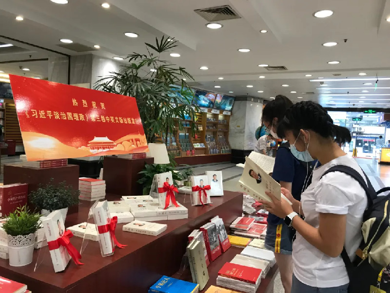 图为读者近日在上海书城设置的《习近平谈治国理政》第三卷专架展台前阅读。外文出版社供图