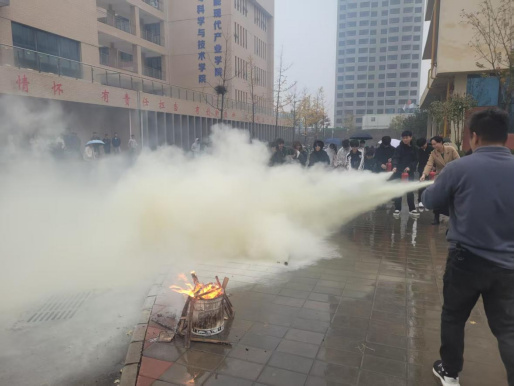 教师及学生代表亲自动手灭火,严格按照“提——拔——握——压”的步骤,迅速扑灭了燃烧的火焰。通过这种直观的模拟操作,同学们对灭火器的操作方法有了更深刻的理解。
