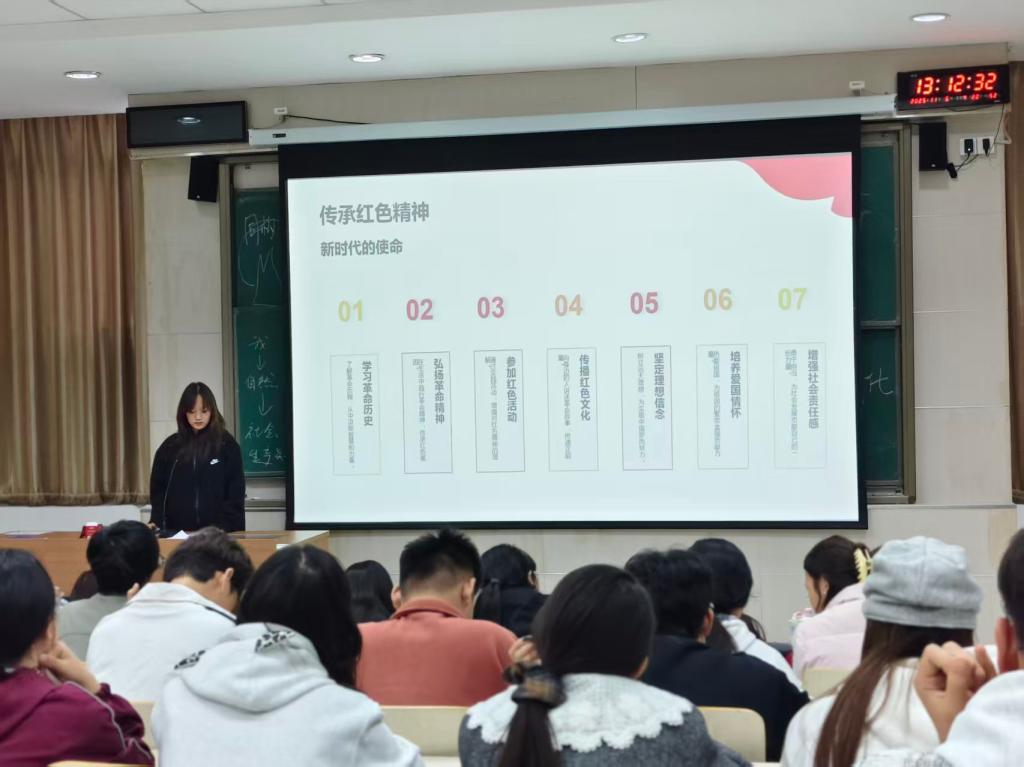 分享会围绕四大板块展开:回顾长征、抗日战争等关键历史进程,梳理红色精神形成脉络;缅怀毛泽东等革命先辈事迹,感悟初心使命;通过《长津湖》《义勇军进行曲》等作品,展现红色精神的现代表达;提出七点行动倡议,号召学生干部主动学习、传播红色文化,在服务同学、建设学院中践行红色精神。