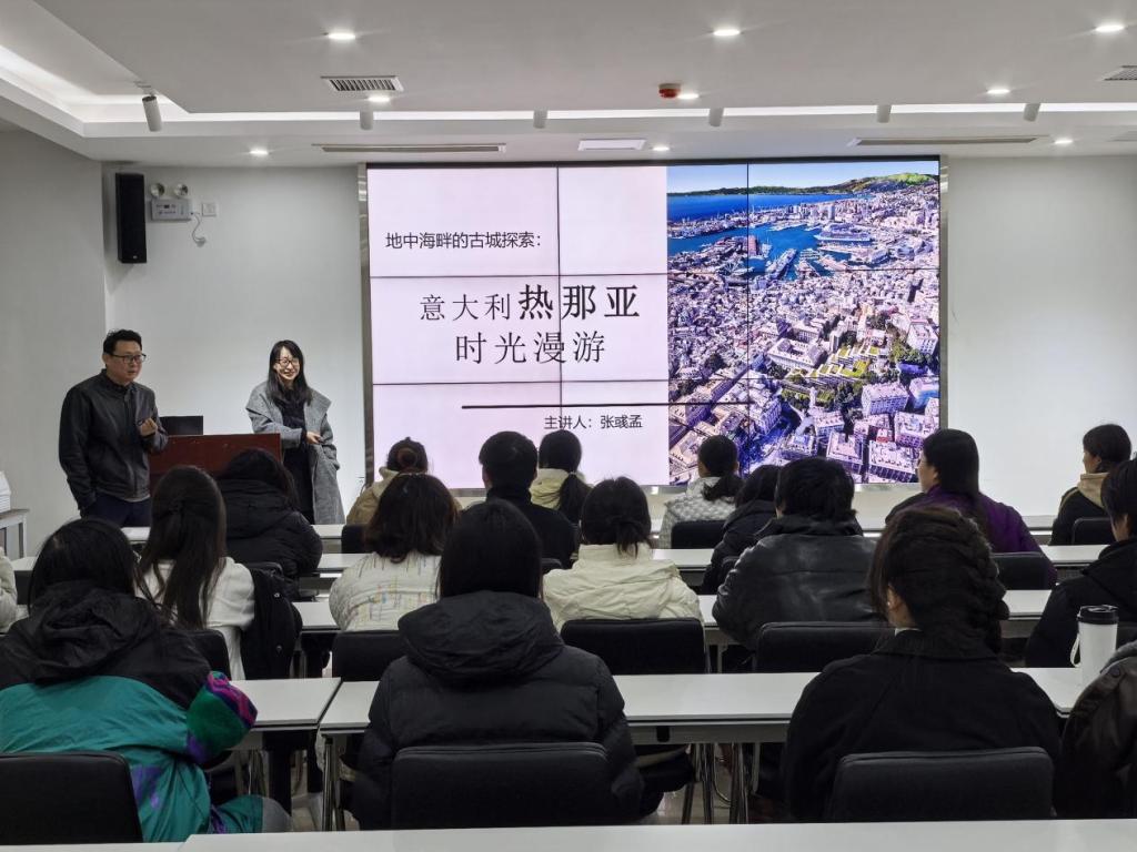 为拓宽美术学院艺术设计产业学院师生的国际视野,推动历史建筑文化与现代设计思维深度融合,提升专业创作的文化底蕴与实践能力,11月27日,“艺术设计系列沙龙”第十讲在至真楼一楼党团活动室如期举行。本次活动特邀张彧孟老师担任主讲嘉宾。张老师毕业于意大利热那亚大学,获建筑学硕士学位,长期深耕建筑设计、建筑历史、古建筑保护与修复材料等核心研究领域,凭借深厚的学术积淀与实践积累,为本次分享提供了专业保障。本次沙龙以 “地中海畔的古城探索:意大利热那亚时光漫游” 为主题,从历史脉络、建筑特色、生活体验三个维度展开,为在场师生带来一场兼具学术性与趣味性的文化盛宴。