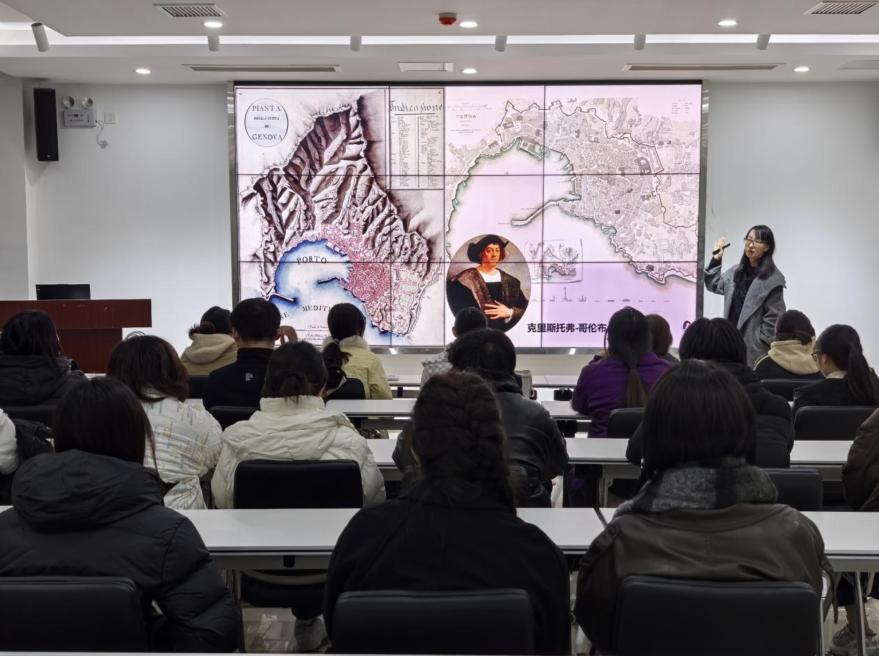 张老师以自身留学经历为切入点,点明热那亚作为意大利中世纪重要城邦的历史地位。她系统梳理了意大利从中世纪城邦分裂到文艺复兴的历史进程,重点阐释了热那亚“三面环山、一面环海”的地理优势如何使其成为中世纪欧洲最大不冻港。从热那亚共和国的军事与商业辉煌,到因“发现新大陆”引发贸易路线转移而走向衰落,张老师结合哥伦布、马可波罗等历史人物的关联故事,让师生直观感受这座城市的历史厚重感及艺术设计相关知识,为后续建筑讲解奠定坚实历史基础。