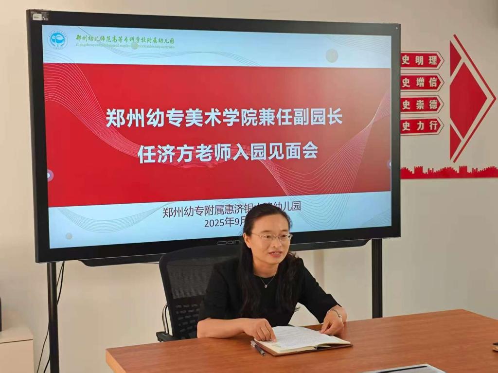 2025年9月9日上午,美术学院副院长任济方赴郑州幼专附属惠济区银山路幼儿园挂职副园长,开启为期一年的高校与幼教实践深度融合之旅。银山路幼儿园园长张琳琳携教师们对任院长的到来表示热烈欢迎,双方就幼儿美育创新与环境创设展开深度交流。