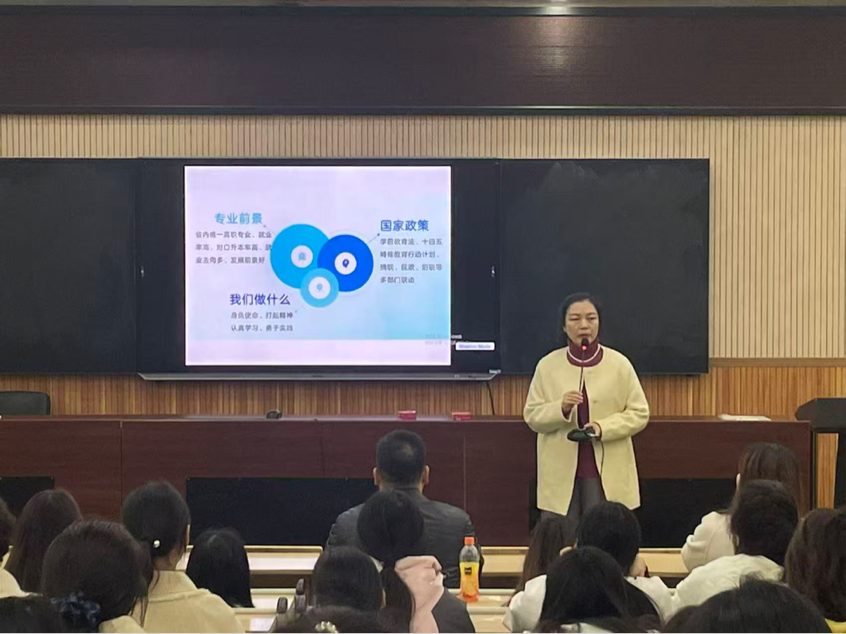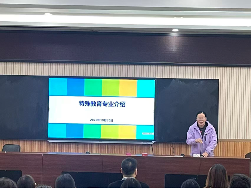 张怡副院长以 “特殊教育的现在与未来” 为主题,从升学、就业与行业前景三大维度,为新生们送上 “成长定心丸”。她用详实数据直观呈现学院办学实力:近三年毕业生升本率稳定在 90% 以上,就业率同步保持高位,毕业生多就职于特殊教育学校、融合教育幼儿园及教育康复机构,岗位对口率稳居前列。“随着国家对特殊教育重视程度持续提升,具备‘教育+康复’复合能力的专业人才缺口日益扩大,” 张院长希望同学们珍惜专业优势,深耕学识、锤炼本领,牢牢把握行业发展机遇,在特殊教育领域实现人生价值。