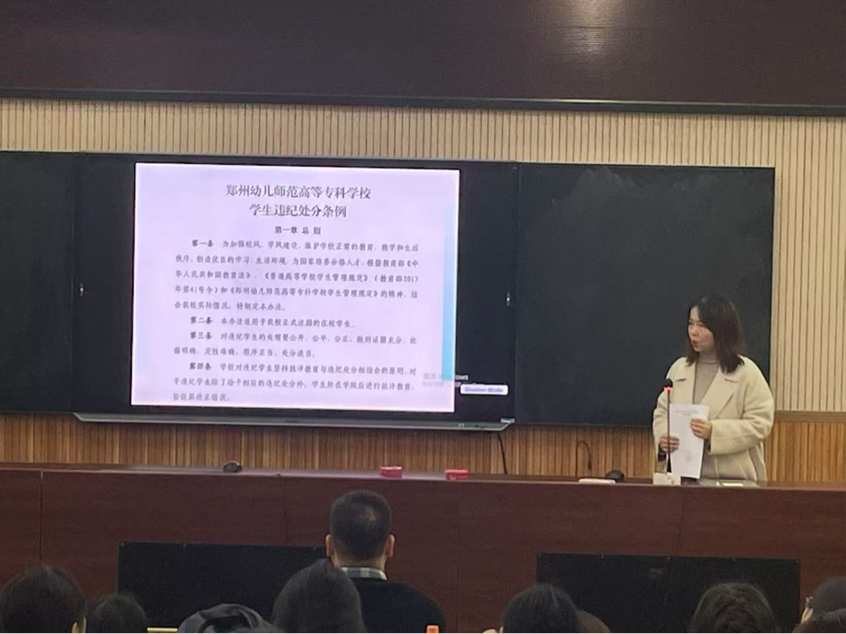 学生工作办公室主任张静老师从“规矩与成长”出发,为新生系统解读校规校纪与学风建设要求。她重点强调课堂考勤、学术诚信与校园安全三大核心纪律:“无故缺课达一定次数将影响成绩评定,学术造假更是‘零容忍’的底线,希望大家从入学之初就树立规则意识,严守纪律红线。” 同时,张静主任介绍了学院学风建设举措:通过奖学金评定、文明宿舍评选等活动,营造 “比学赶超 ”的学习氛围与整洁有序的校园环境。良好的学风是成长的助推器,希望大家主动融入集体,共同打造积极向上的校园风气。