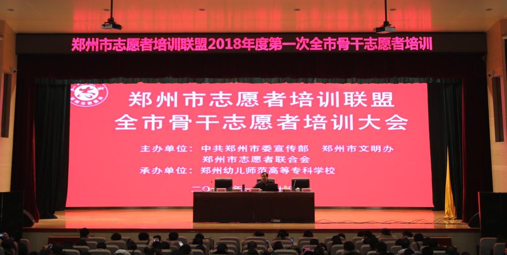为学习贯彻全国《志愿服务条例》,培育专业化、规模化的骨干志愿者队伍,根据郑州市文明委《关于推进全市志愿服务制度化的实施意见》要求,1月17日上午,由中共郑州市委宣传部、郑州市文明办、郑州市志愿者联合会主办、我校承办的2018年第一次全市骨干志愿者培训会议在老校区礼堂举行。县(市)区文明单位、街道办、社区志愿服务工作负责人代表及市直单位志愿者代表共600余人参加会议。会议由团委书记任世卿主持。