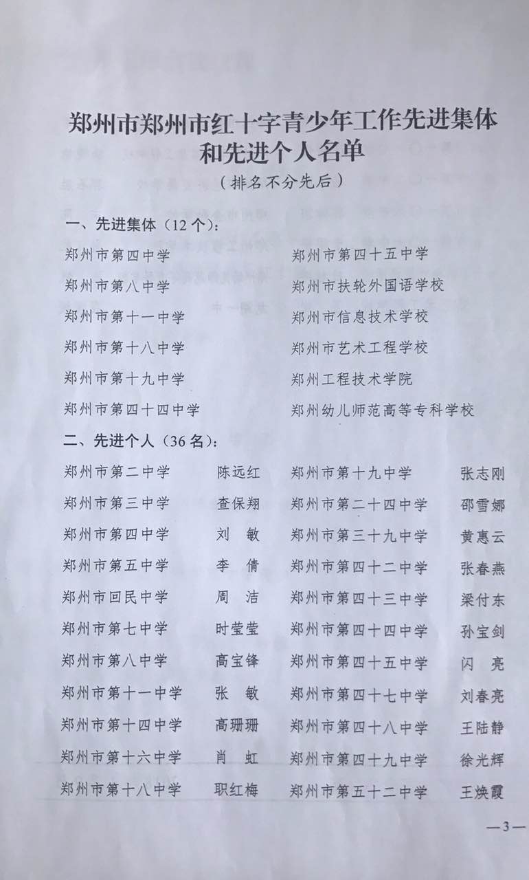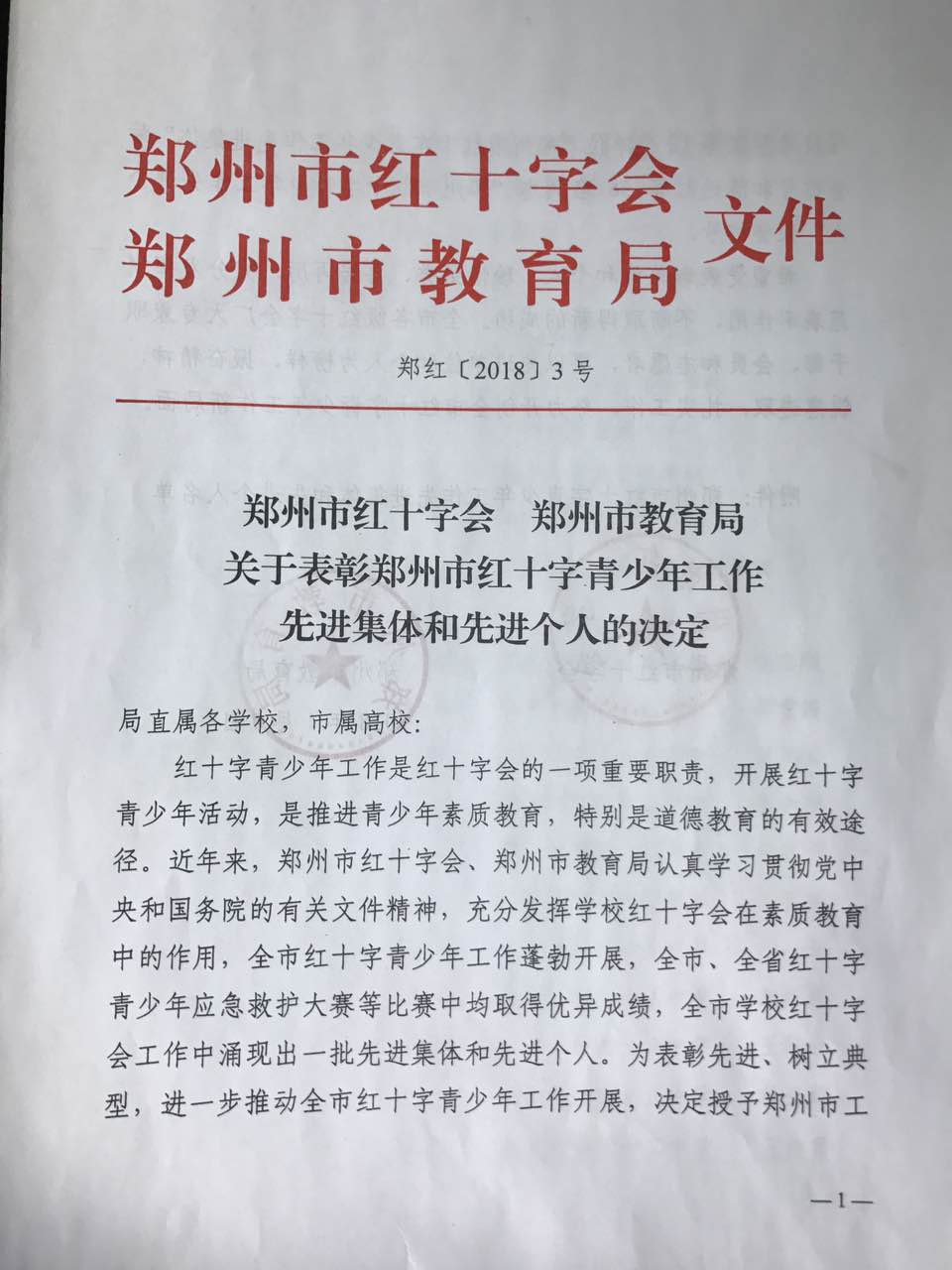 在2018年1月18日上午召开的郑州市红十字青少年工作会议上,我校被郑州市红十字会、郑州市教育局授予“郑州市红十字青少年工作先进集体”荣誉称号,张帆老师同时荣获“郑州市红十字青少年工作先进个人”荣誉称号。郑州市红十字会、郑州市教育局相关领导出席了本次会议。