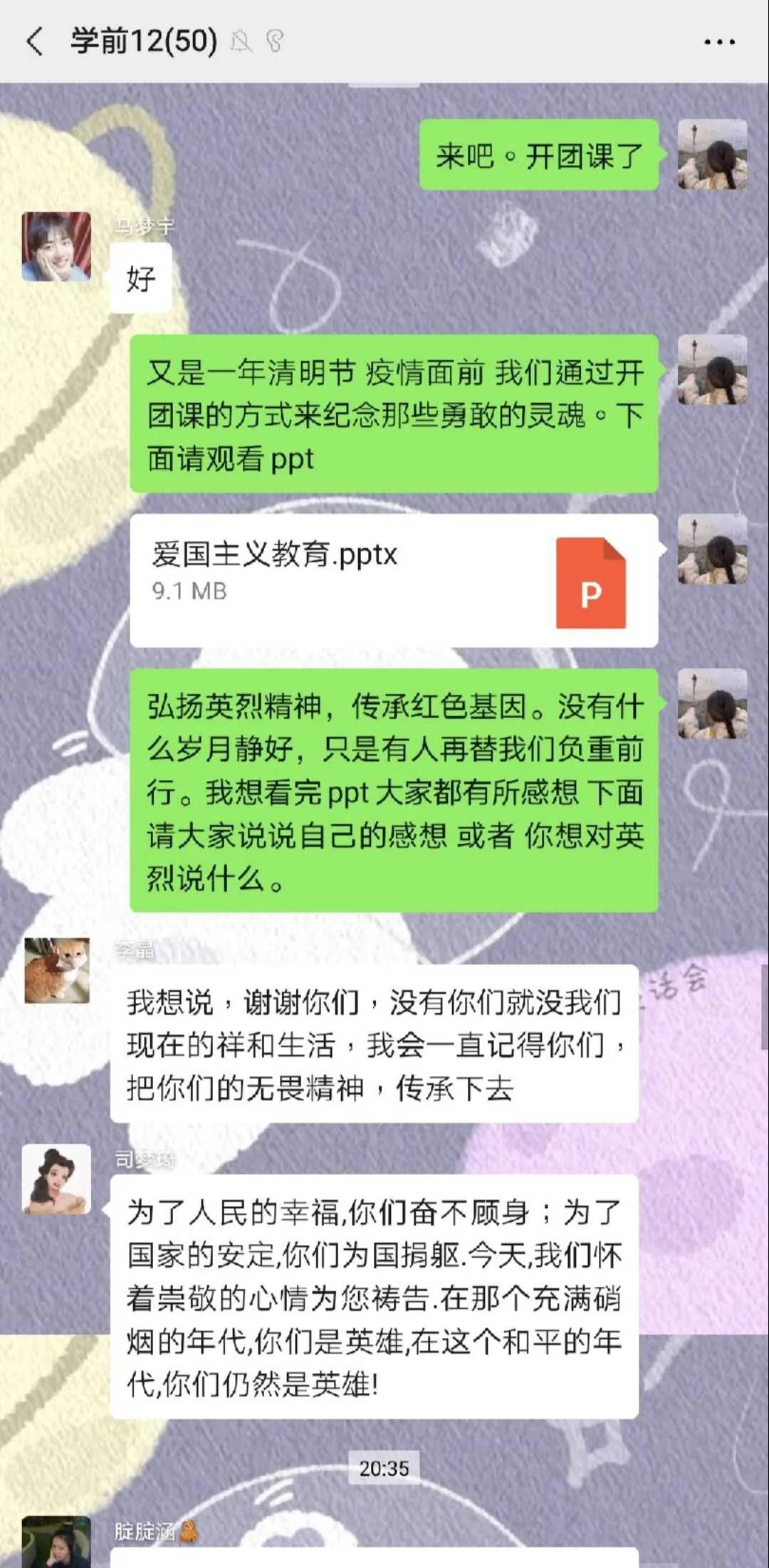 团课部也要求同学们在家中认真配合,开展了丰富多彩的团课,大家通过网络媒体等多种途径搜集相关资料,以PPT为主要素材,以云演讲、班级群发言为主要形式,引导同学们缅怀先辈、学会感恩,铭记责任、向往未来,立志接过前辈的“接力棒”,为实现中华民族伟大复兴的中国梦而努力学习。