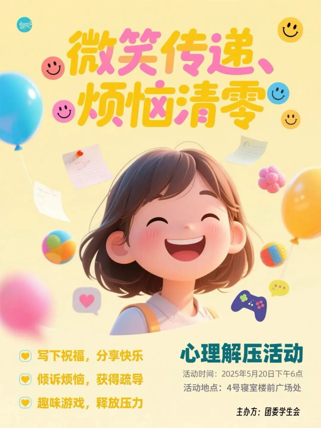 “微笑是最好的治愈良药”。在忙碌的学习生活中,我们难免被烦恼萦绕。团委学生会特举办“微笑传递、烦恼清零”心理解压活动,助你释放压力、舒缓心情。在这里,可写下祝福传递快乐,倾诉烦恼获疏导,参与趣味游戏解压,拥抱好心情。