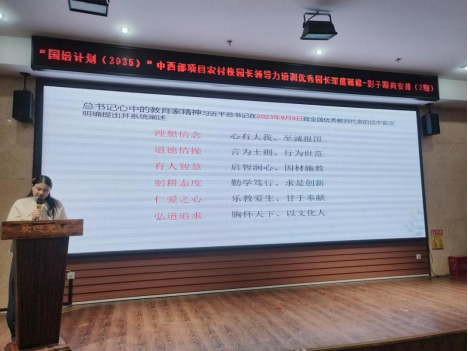 随后,张俊仙园长以《以情怀为舟,以热爱为桨,共赴幼教新征程》为主题展开分享。她通过图文并茂的形式,结合精心整理的照片与视频,带领现场学员共同回顾了15 天培训中的学习日常与温暖瞬间,让大家再次重温了研修过程中的满满收获与真挚情谊。张园长的分享围绕三个维度层层递进:一是 “因爱相聚,破冰融化陌生;为梦同行,我们成为集体”,回顾了学员们从陌生到默契、在交流研讨中共同成长的珍贵历程;二是 “叩问初心,重塑价值”,畅谈了培训带来的教育理念革新与职业信念升华;三是 “深耕沃土,静育花开”,表达了扎根乡村幼教、潜心育人的坚定决心。她表示,返程后将把本次研修所学系统梳理,转化为清晰可行的园所发展行动纲领,切实落实到乡村幼儿园的日常教育与管理中,让教育真正扎根于脚下的土地,用专业素养与满腔热爱,为乡村孩子们打造有根、有乐、有梦的幸福童年。