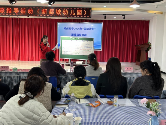 为深化“国培计划”培训成效,推动学前教育优质均衡发展,2026年3月26日,郑州幼儿师范高等专科学校组织专家团队,前往安阳市北关区新都城幼儿园开展跟踪指导活动。本次活动特邀梅纳新教授、郭荣芳老师担任指导专家,与园所教师、国培班学员、北关区姊妹园所教师共同探讨学前教育高质量发展路径。