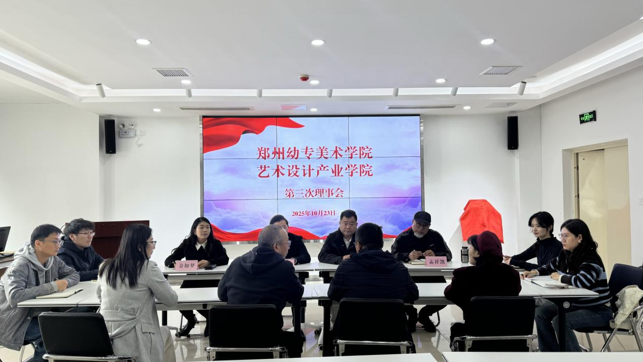 2025年10月23日下午14:20,艺术设计产业学院第三次理事会在美术学院党团活动室圆满举行。本次会议由理事会秘书长金如梦主持,理事长朱晓飞、全体理事及郑州幼专美术学院党总支书记许颖参会,艺术设计产业学院专业建设指导委员会专家应邀列席。会议聚焦理事会结构优化与下阶段发展规划,同步吸纳专家智慧,为产业学院教学、管理与人才培养工作注入新动能。