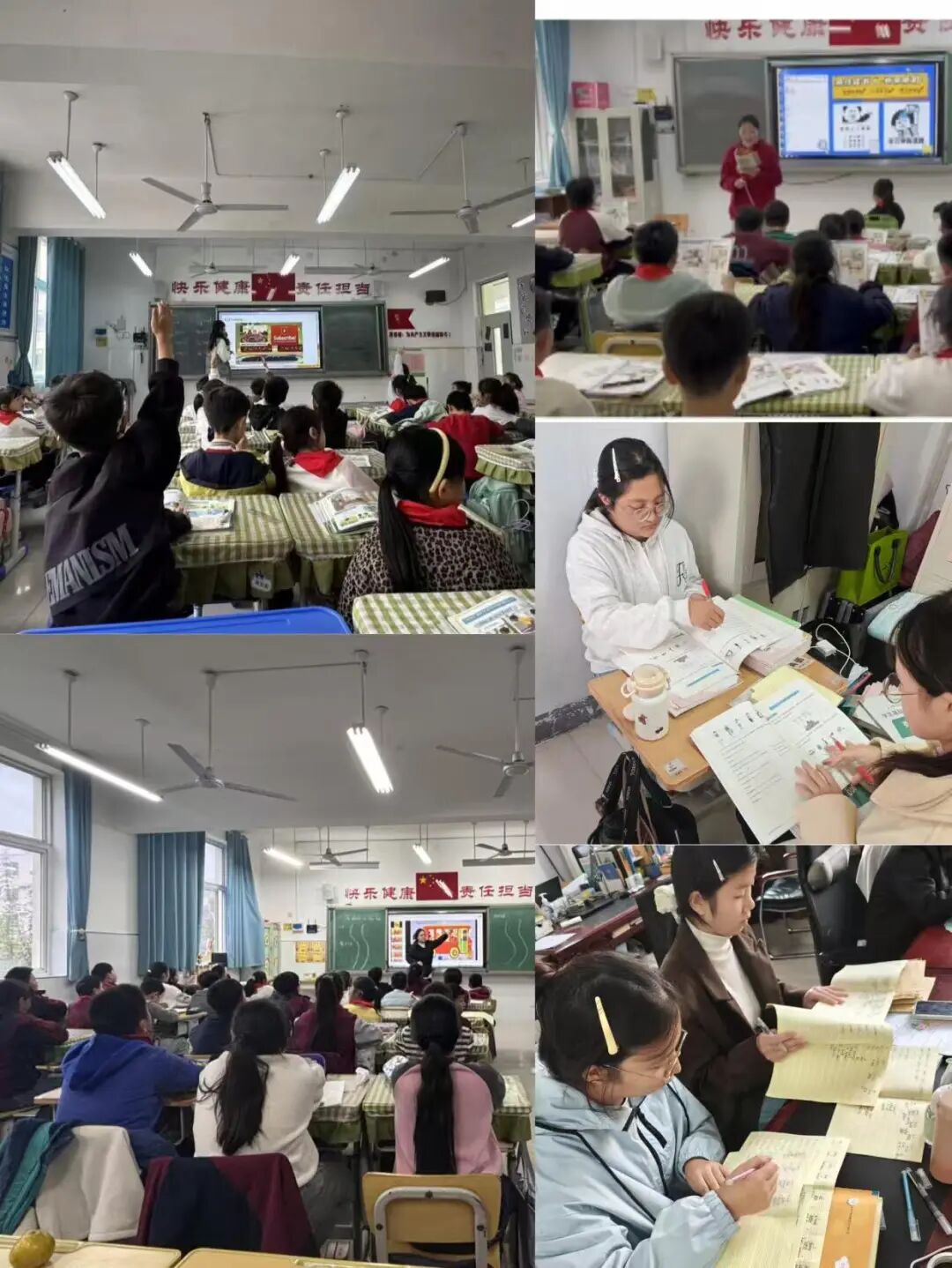 (24级英教一班杨雪,24英教二班刘念、刘瑾在课堂上进行教学;24级英教一班陈梦丽、周倩倩、索婧愉、刘悦蕊帮助老师批改作业)