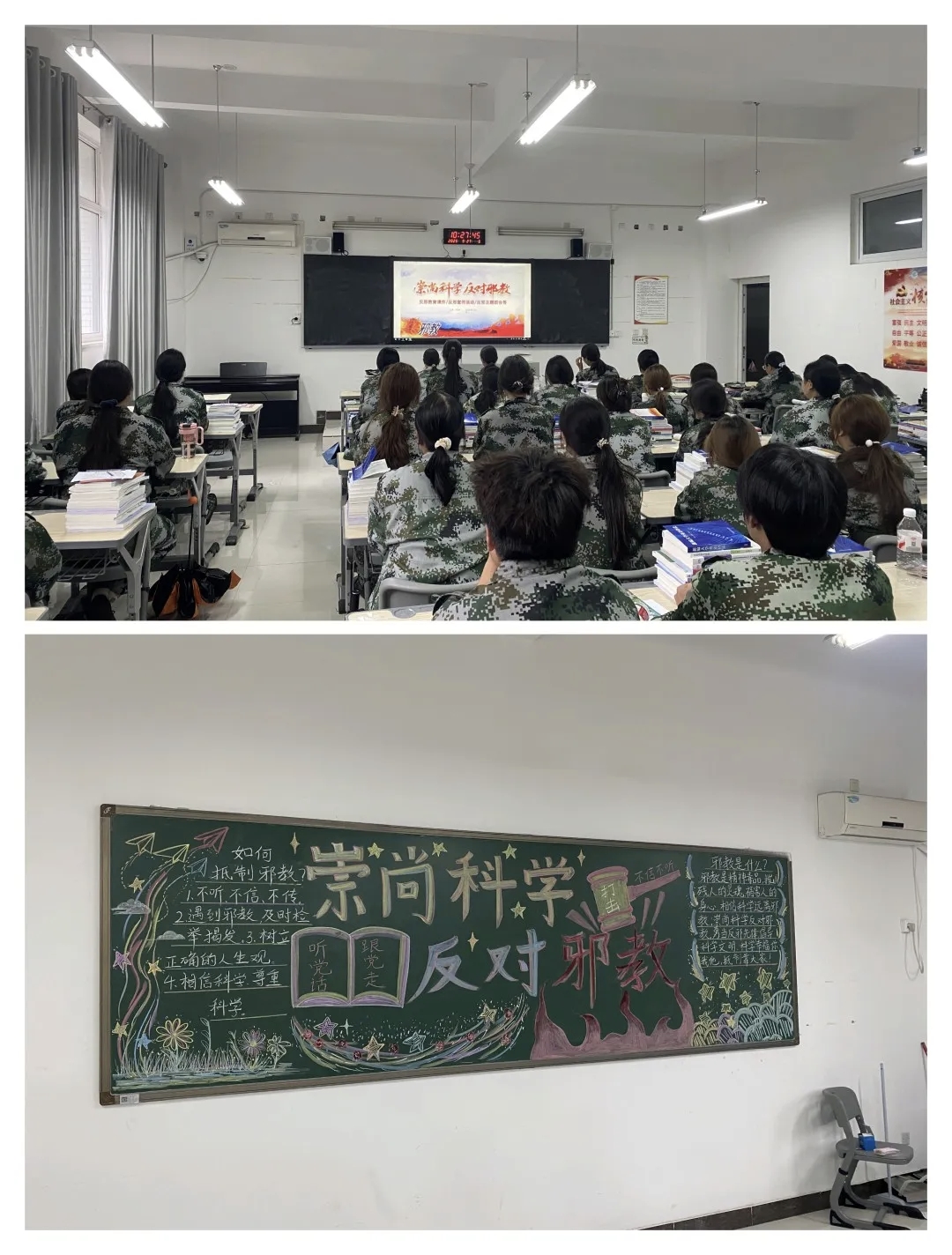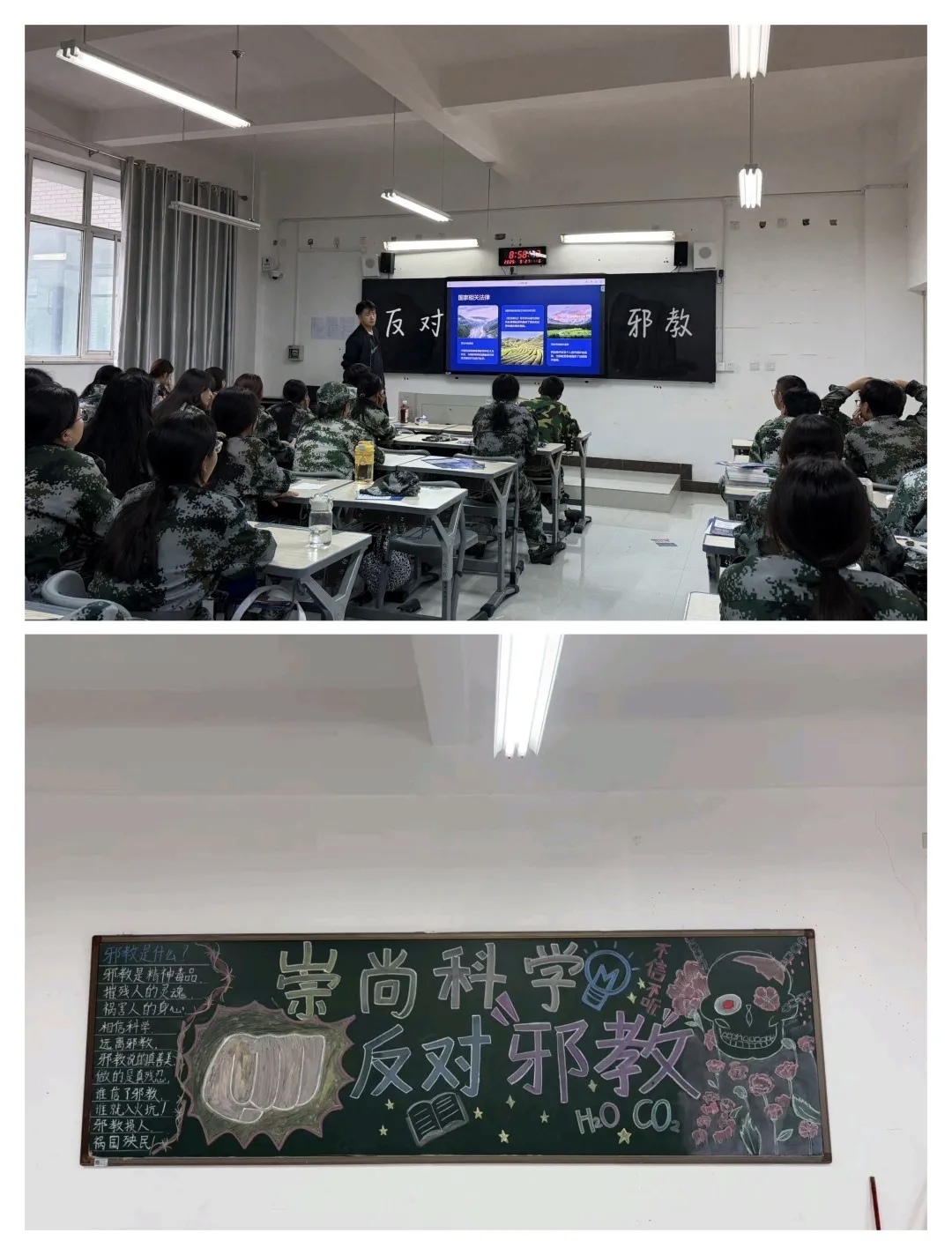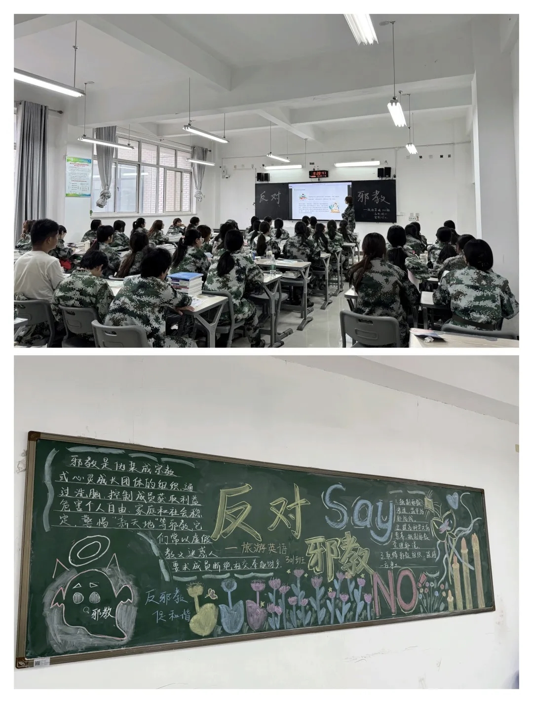 班会中,各班级以多元形式深化反邪教教育:以主题宣讲为核心,系统讲解邪教本质、特征及对个人健康、家庭和谐、社会安全的危害,帮助同学们清晰认知邪教;以案例分析为重点,结合真实案例拆解邪教编造谎言、实施精神控制的伎俩,有效提升同学们的辨别与防范意识。各班级同步制作反邪教主题黑板报,通过图文并茂的设计普及反邪教知识,为校园营造出浓厚的反邪教宣传教育氛围。
