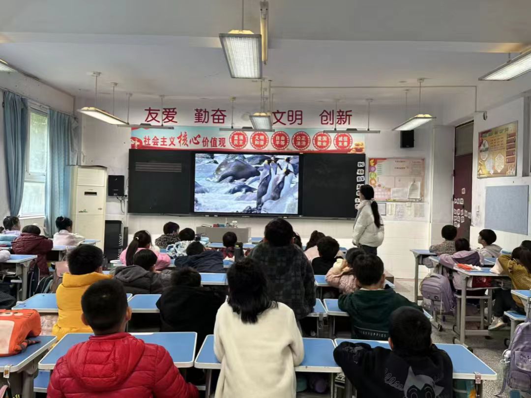 (杜媛媛实习生在看餐结束后带领同学一起观看纪录片动物世界,增长孩子们的科学知识)