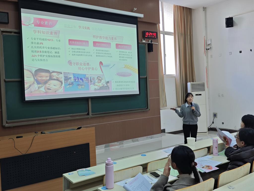 大赛分设成长赛道与就业赛道,采用“主题陈述+评委提问”的现场比拼形式。赛场上,选手们结合职业生涯规划书、个人简历,围绕职业目标、行动规划、岗位胜任力等内容展开精彩展示与答辩,充分彰显了幼专学子清晰的职业定位与昂扬向上的青春风采。由各学院遴选的5位评委老师,从作品质量、现场表现等多维度进行专业评审,针对选手在规划设计、职业认知等环节存在的不足,给出切实可行的指导建议。