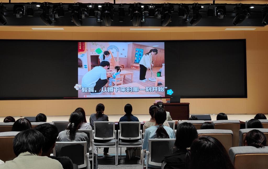 在主题分享环节,教工幼儿园王主任以《用爱领舞,做幸福的教育工作者》为题,深情讲述了自己28年的从教经历。通过讲述自己的真实案例,生动诠释了师德的深刻内涵。随后又对我院托育专业学生进行职业发展规划的指引。