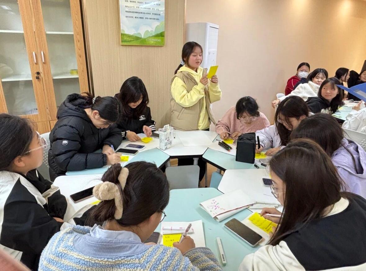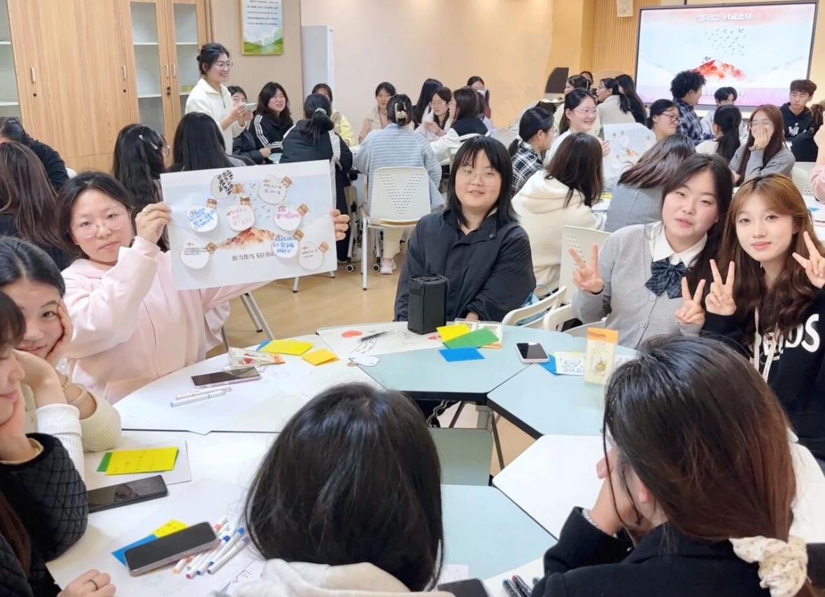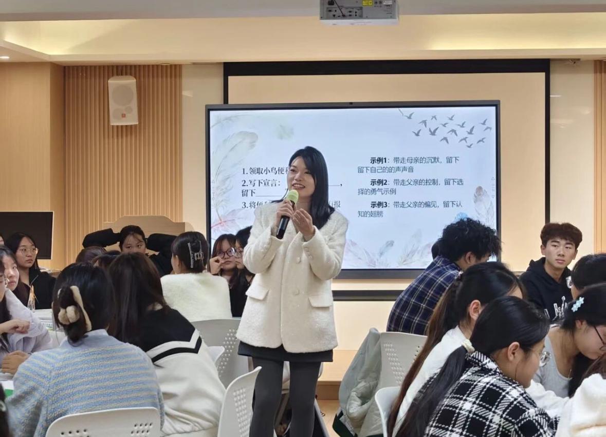 活动尾声的“飞鸟宣言”仪式中,同学们在小鸟形状的便利贴上写下“带走”与“留下”的话语,贴于“飞鸟群”海报,象征放下枷锁、拥抱自我的决心。最后,学工负责人甘莹老师对这本书进行了深度解读,详细阐释了这本书所赋予大家的内在成长力量。整场读书会在合影中圆满落幕,留下感动与思考的珍贵瞬间。