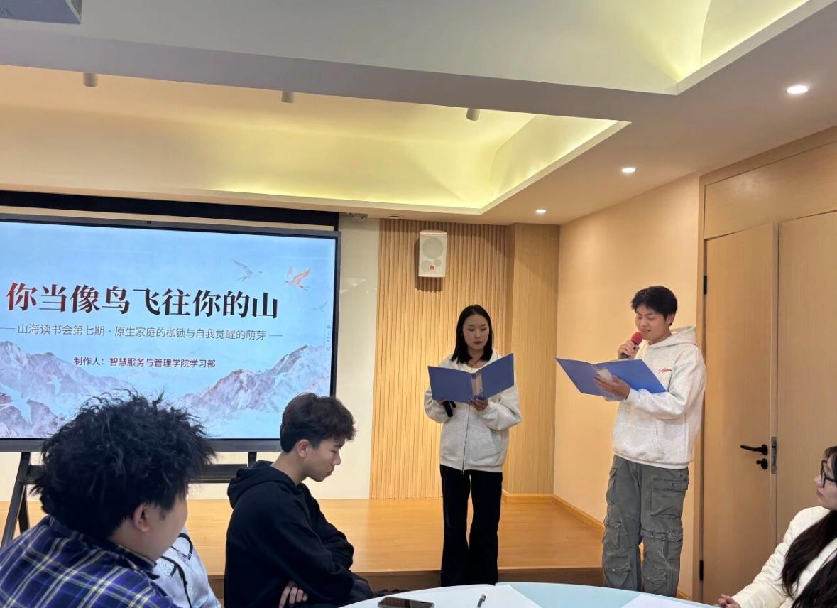 2025年10月30日晚上,由智慧服务与管理学院学习部策划的第七期山海读书会,在心理健康教育中心团体活动室成功举行。本次读书会以“原生家庭的枷锁与自我觉醒的萌芽”为主题,围绕畅销作品《你当像鸟飞往你的山》展开,吸引了众多同学积极参与,共同走进作者塔拉·韦斯特弗的成长世界,展开一场关于家庭、教育与自我成长的深度对话。