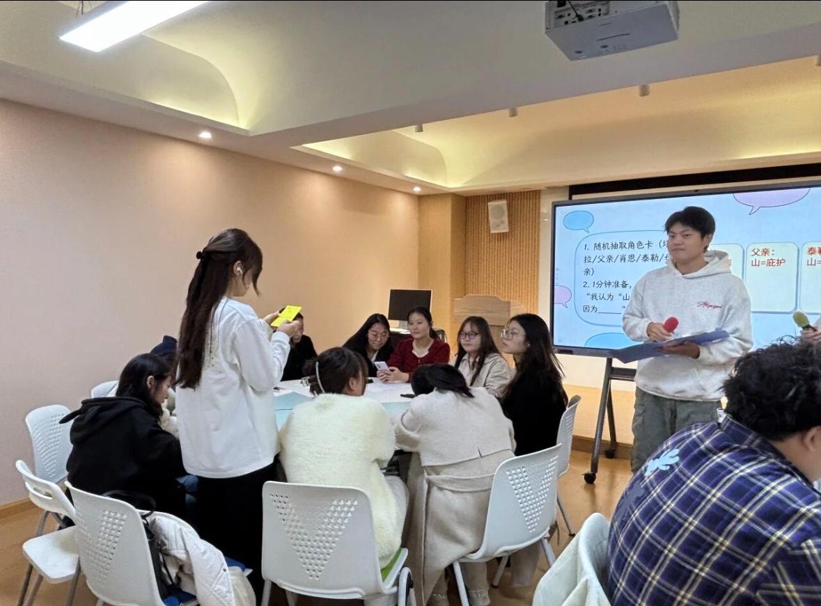 在“破冰游戏:你是谁的山?”环节中,同学们通过抽取角色卡,代入塔拉、父亲、肖恩等不同人物的视角,表达对“山”的多元理解。这一环节不仅增强了参与者对角色心理的理解,也为后续的思辨讨论奠定了情感基础。
