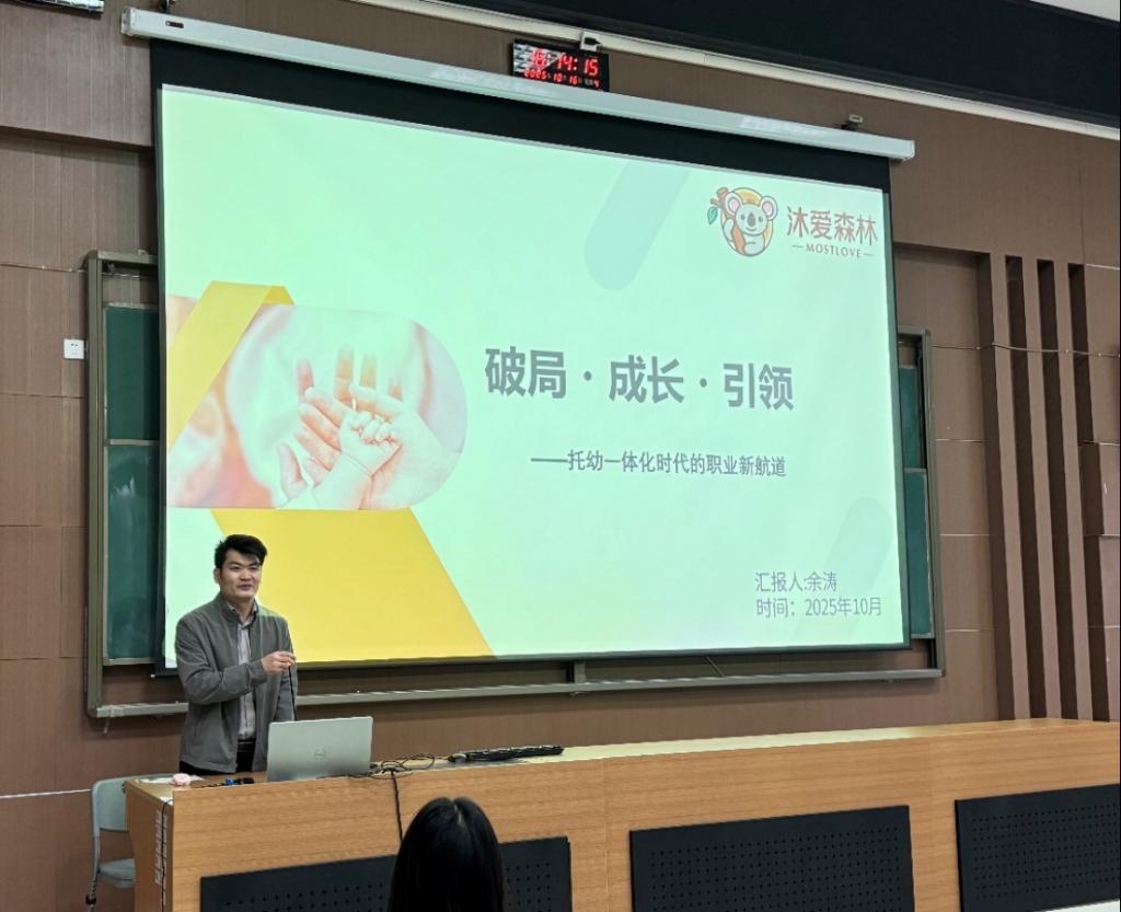 会议伊始,沐爱森林余涛博士以“破局认知,引领成长”为主题作专题分享。他引用赫克曼曲线理论,强调0-3岁是人生发展中社会投资回报率最高的阶段,指出当前早教托育行业对“懂教育、通照护、善沟通”的复合型人才存在近百万人缺口,清晰揭示了专业的时代价值与发展前景。余博士还通过数据对比,分析了当前就业形势与托育早教领域优质岗位的差异,指出该行业是一片潜力巨大的职业蓝海,鼓励同学们把握行业发展机遇,努力成为引领未来的专业造风者。