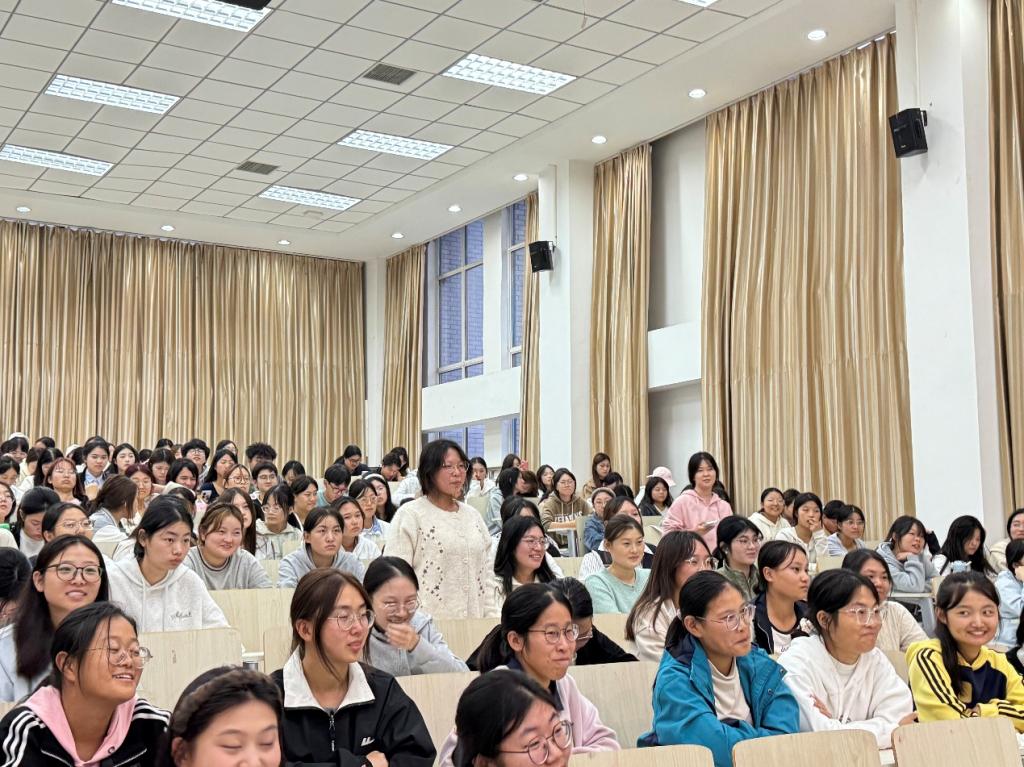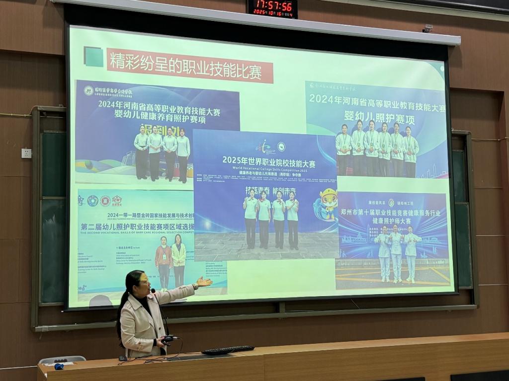 随后,王海霞主任围绕专业建设与学生发展路径作系统介绍。她首先解读了早期教育、婴幼儿托育服务与管理专业的人才培养目标与课程体系,展示了专业师资队伍的结构与优势,并介绍了校内实训室与校外实践基地的建设情况。在就业发展方面,王主任详细说明了毕业生主要就业方向,包括优质早教中心、托育机构及相关创业路径,并鼓励同学们提前规划、多元发展。针对学历提升,她系统介绍了“专升本”的对接院校、报考条件与备考策略。在职业资格认证方面,王主任梳理了育婴师、早期教育指导师等行业重要证书,分析了其就业助力作用与报考建议。她还通过展示学生在省级、国家级技能大赛中取得的优异成绩,生动呈现了学院在实践教学与以赛促学方面的丰硕成果,为新生后续专业学习树立了信心、指明了路径。