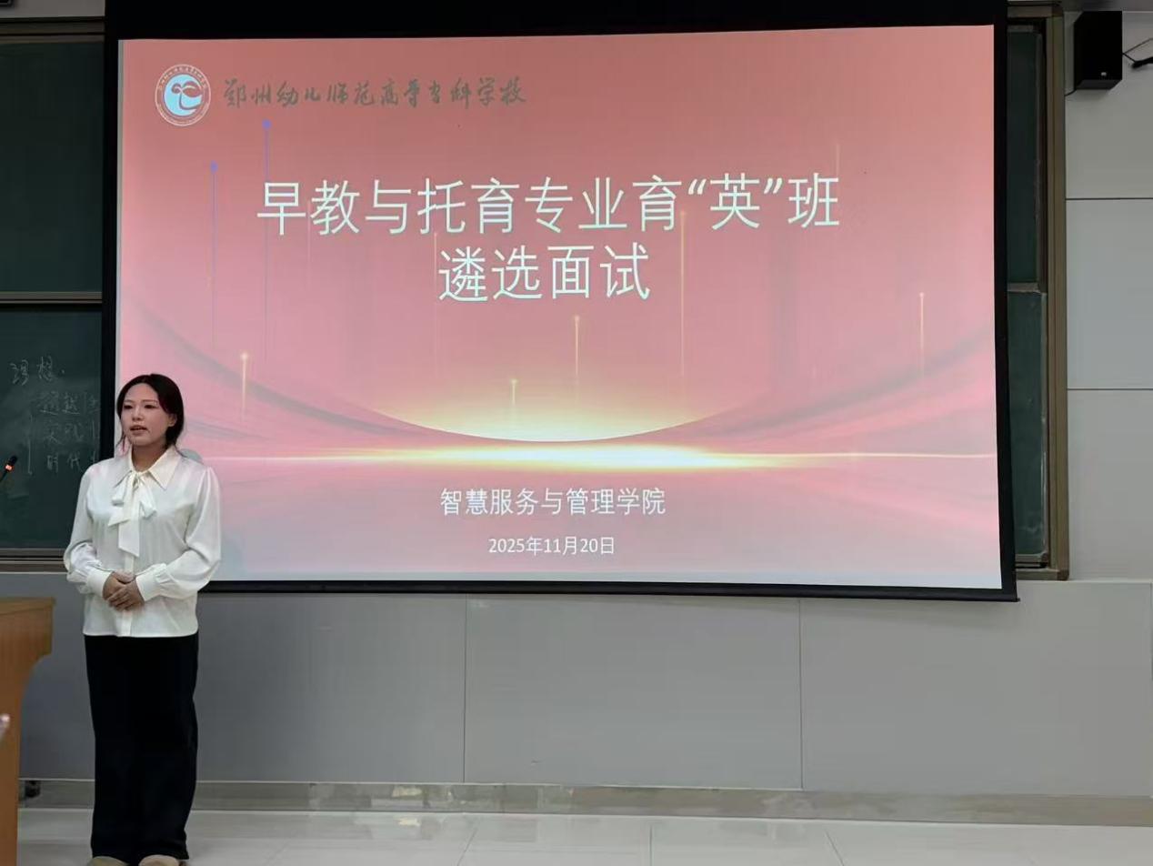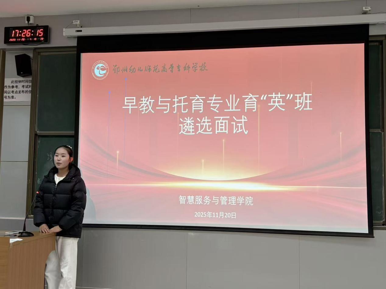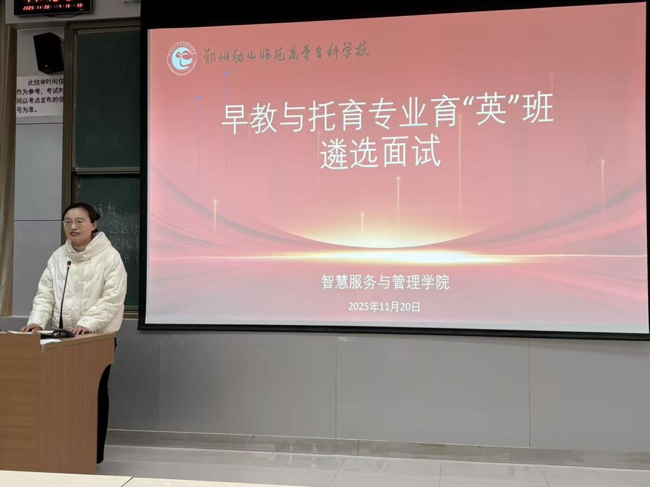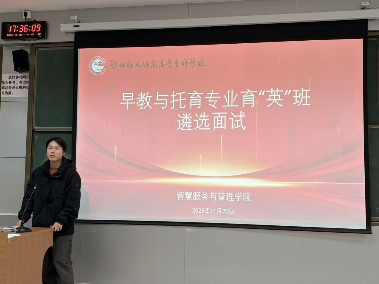为进一步优化人才培养模式,选拔专业基础扎实、综合素质突出的优秀学子进行精细化培育,智慧服务与管理学院于2025年11月20日在笃行楼多媒体1教室举办早教与托育专业育“英”班遴选面试。由任济方院长,王海霞主任,甘莹老师,曾广玉老师组成专业评委团,全程参与评审工作,学生们踊跃报名、积极应战,现场氛围热烈而有序。